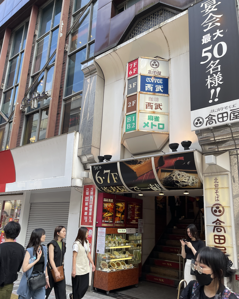 珈琲西武という店名。よーくみると階段に並んでいる人影がみえる。